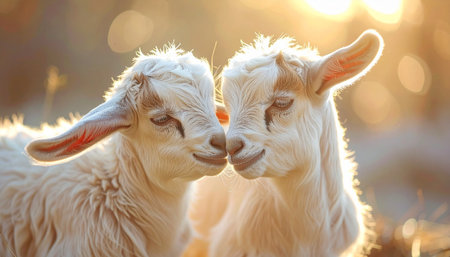 In the soft glow of a setting sun, two young lambs share a tender moment. Their gentle nuzzle captures a feeling of innocence, friendship, and the simple, heartwarming beauty of new life on the farm.