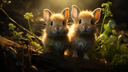 Two meticulously detailed rabbit faces in close-up, showcasing their textured fur and expressive eyes against a neutral background. ideal for nature photography, wildlife presentations, or zoological studies. Generative AI