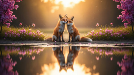 Two red foxes, Vulpes vulpes, sitting on the shore of a pond at sunset