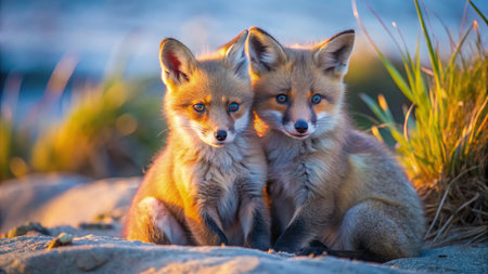 Wild Baby Red Foxes Cuddling Together at the Beach During Sunset. Generative AI