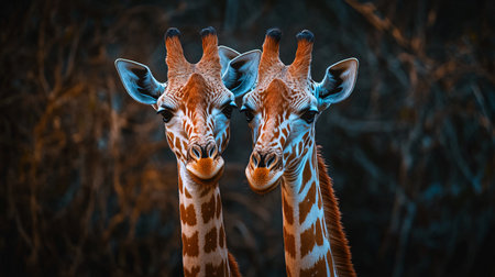 Two giraffes standing next to each other in a forest. The giraffes are looking at the camera and appear to be enjoying the moment