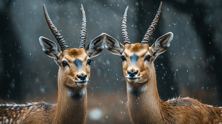 Two deer are standing close to each other, with snow on their heads. The scene is calm and tranquil, as the deer appear to be enjoying each other's company in the snowy landscape