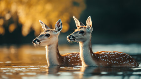 Two deer are swimming in a body of water. The water is calm and the sun is shining on the surface