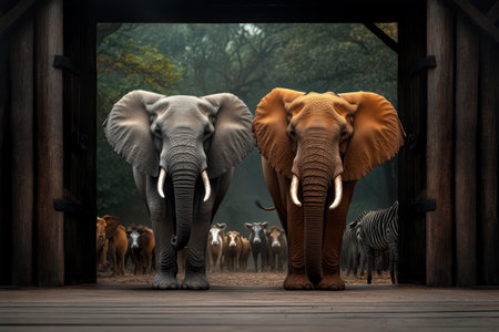 Majestic elephants stand at the entrance of a tranquil forest, surrounded by wildlife under a soft morning light. Generative AI