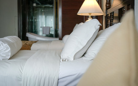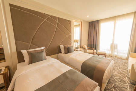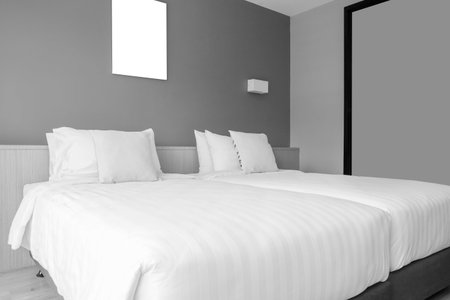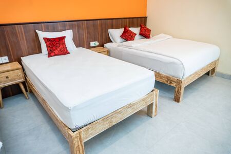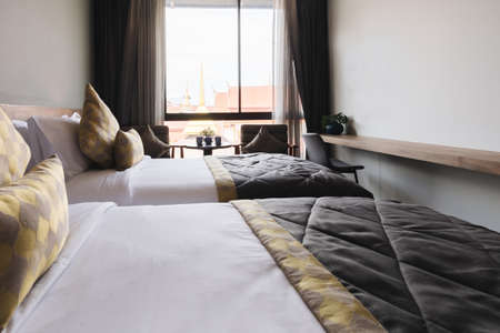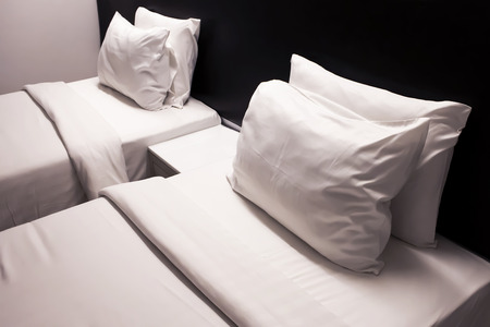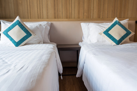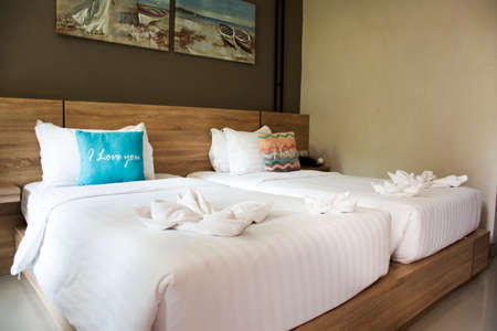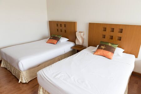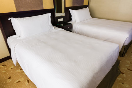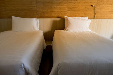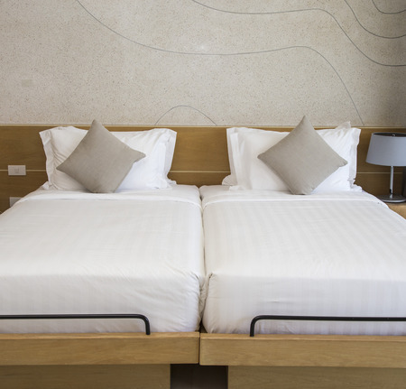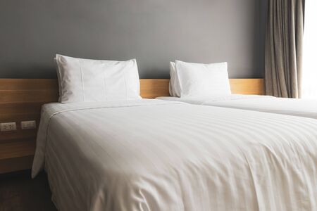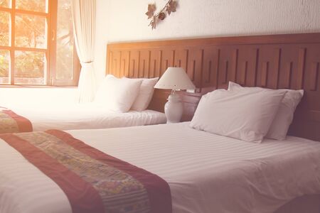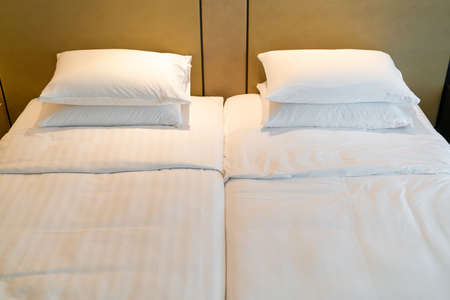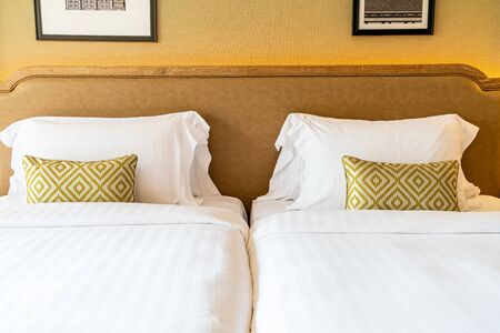 White clean comfortable pillow on two bed decoration interior of hotel bedroom of brown background - Hotel bed with space for text and beautiful