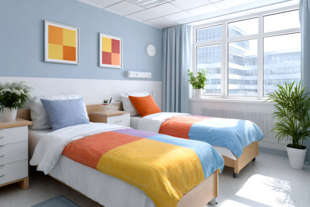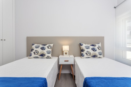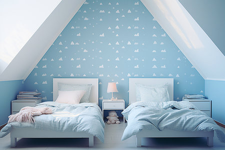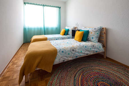 Spacious room for children with two single beds, colored sheets and lots of pillows. Nobody inside