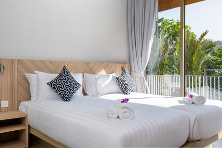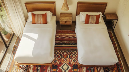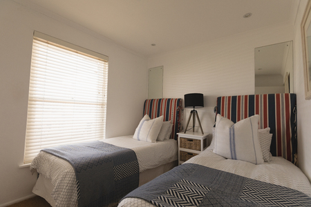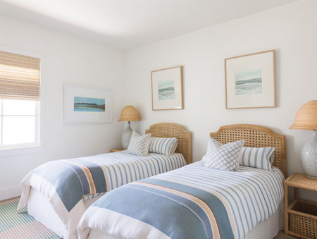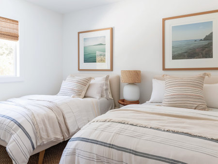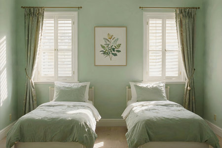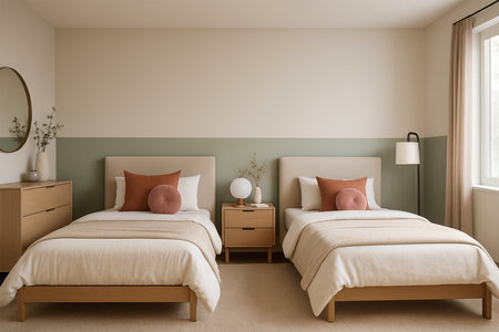 Cozy bright twin bedroom with patterned bedding, pastel curtains, soft daylight and clean modern design creating a peaceful home atmosphere.