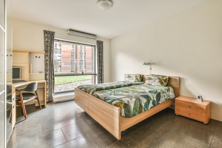 The interior of a bedroom with a wooden bed and a working place with a computer in a modern house