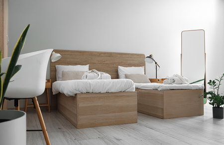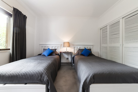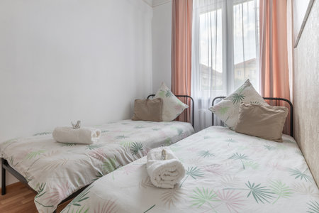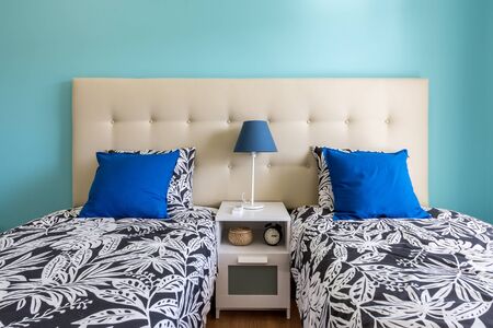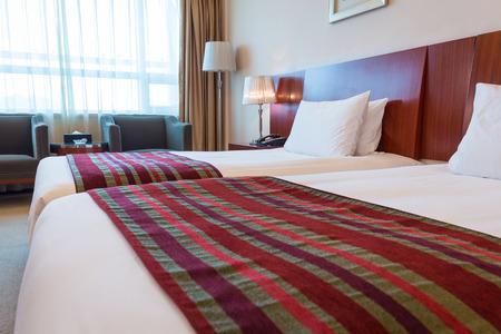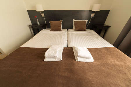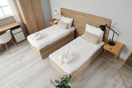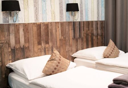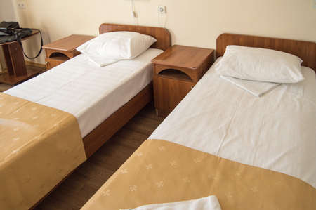 Hotel room with two empty SINGLE beds and bedside tables, the concept of the hotel business.
