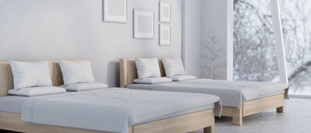 The interior design of a contemporary minimalist hotel bedroom features double queen-size beds and a winter snow view through the window. 3d render, 3d illustration