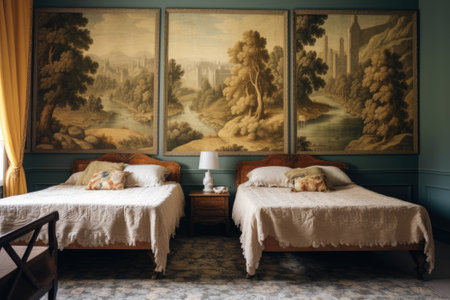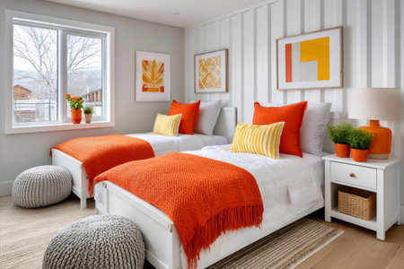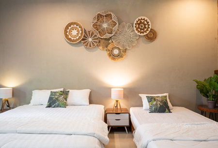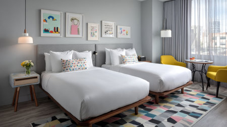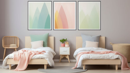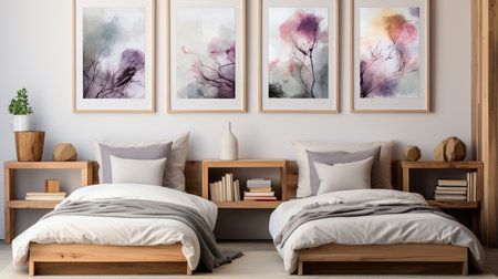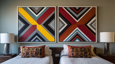 A contemporary bedroom featuring twin beds, stylish decor, and a beautiful wall art piece. The room blends comfort with modern aesthetics.