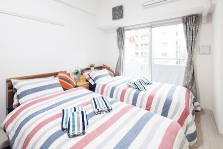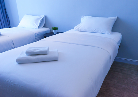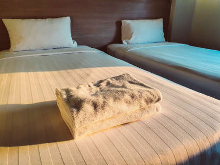Clean white towel on white clean bedroom in the budget room for traveller with sunset light from the window