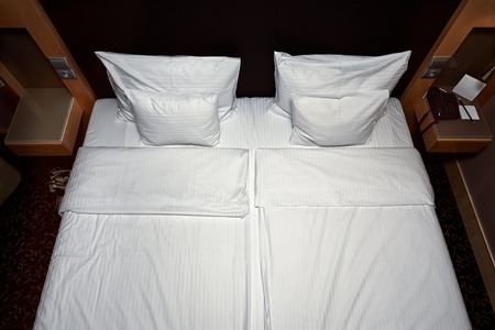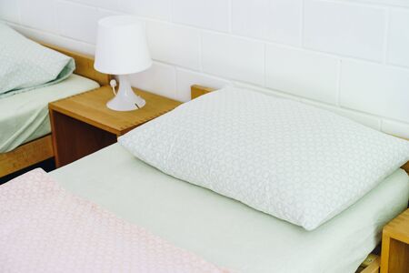 Modern bedroom with pillows and a bed for tourists. Frontally.