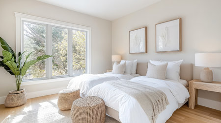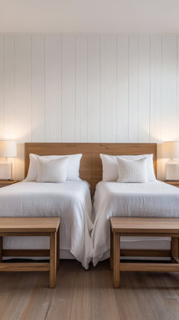 Minimalist Japanese hotel room with twin beds and soft white bedding, shoji screen. Modern ryokan interior