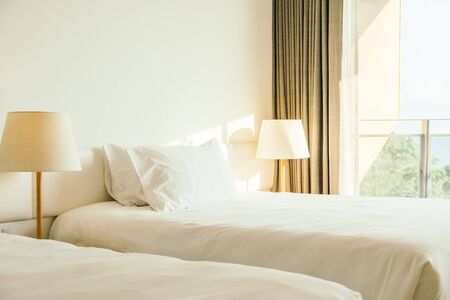 Bedroom luxury design and pillow in hotel. Selective focus and soft flare sunlight.