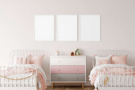 Frame mockup in child room interior. Nursery Interior in scandinavian style. 3d rendering, 3d illustration
