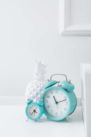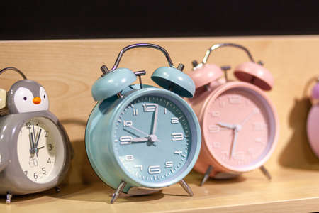 Round alarm clock on the store shelf close-up. Sale of various watches and alarm clocks of different colors. Retro alarm clock on the table, vintage tone.