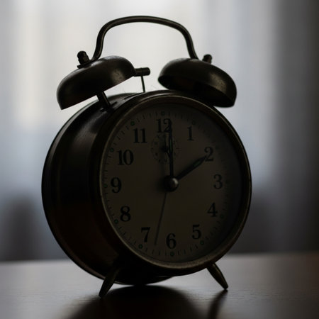 Editorial photograph capturing a retro twin-bell alarm clock set exactly to 6:00 AM, viewed in a dra