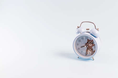 Front white vintage alarm clock analog classic style isolated on a gray background