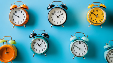 Vintage alarm clocks on blue background. Flat lay, top view.