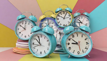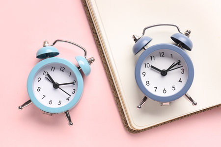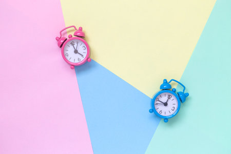 Small blue and pink alarm clocks on colorful pastel background flat lay creative minimal concept.