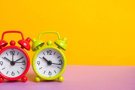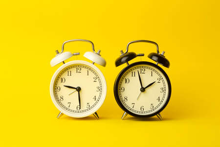 Time background concept. Vintage classic alarm clock on yellow empty background. Time management comcept