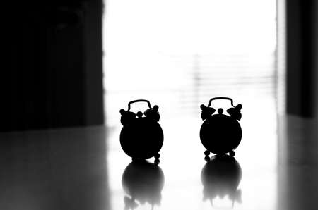 Close up vintage black alarm clock Placed on a black wooden table, blurred background