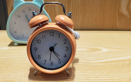 Old fashion alarm clock on top of wooden desk in vintage looks.