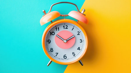 Retro alarm clock on yellow background with blue pink pastel circles for copy space. Top view