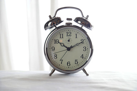 A close-up, front-facing view of a vintage-style silver twin bell alarm clock. It sits on a textured white surface, with a softly lit white background.