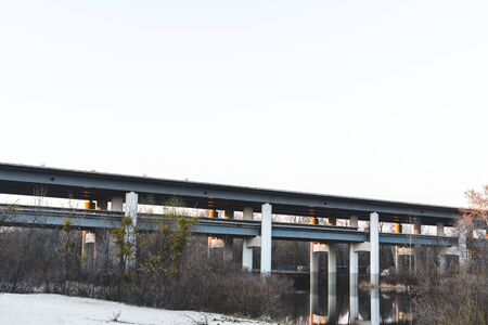 Reinforced concrete bridge over river with reflection in water in spring