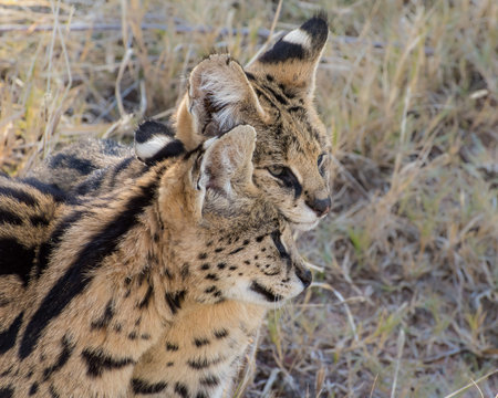 Two Affectionate Adult Serval Cats, Portrait