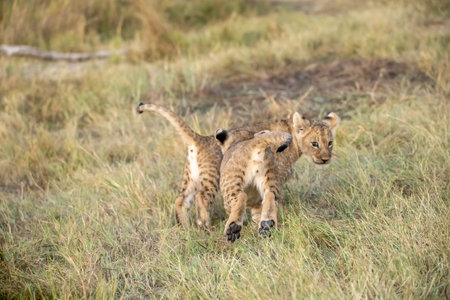 Lion cubs in the savannah of Maasai Mara National Park in Kenya