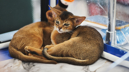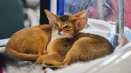 Abyssinian kittens resting in a cage at cat show
