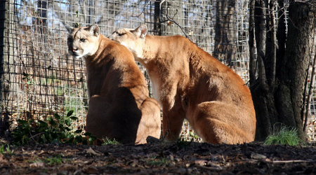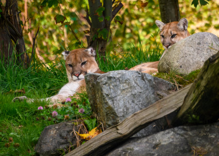 Two mountain lions are lounging on a grassy hillside, nestled among rocks and foliage. Sunlight filters through the trees, casting a warm glow on their fur as they relax peacefully.