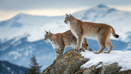 Two Eurasian lynx (Lynx lynx) standing on a rock in the mountains