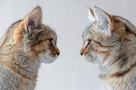 Two cats are looking at each other. Close-up. Gray background.