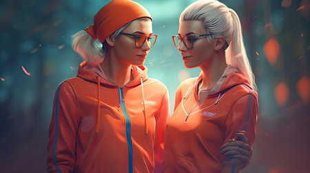 Portrait of two sporty women in orange sportswear. 3D rendering
