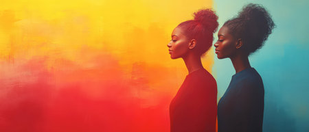Two women stand side by side, their profiles highlighted by a colorful gradient background of yellow, orange, and blue in an artistic studio setting.