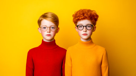 Twin brothers wearing colorful turtlenecks and glasses posing on yellow background