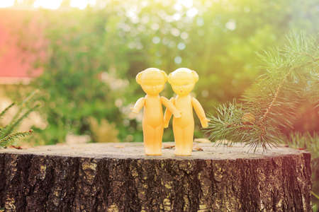 Retro dolls - twins standing on the stump. Mass production made in USSR, 1970-1980.
