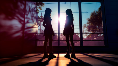 Couple of women standing next to each other in front of window. Generative AI.