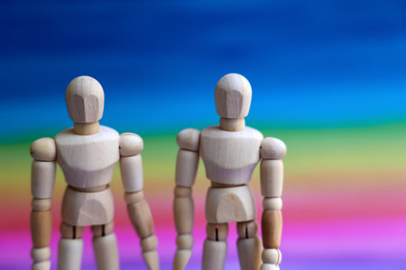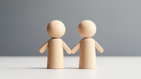 Two wooden figurines stand together, holding hands in a clear expression of friendship and connection. Ideal for themes of togetherness and love.