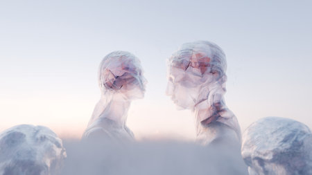 Metaphorical dialogue and exchange of thoughts. Two crystal heads in the clouds are talking to each other