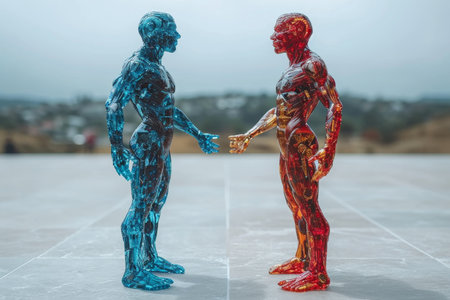 A three-dimensional image of two men in blue and red opposite each other. 3d illustration.