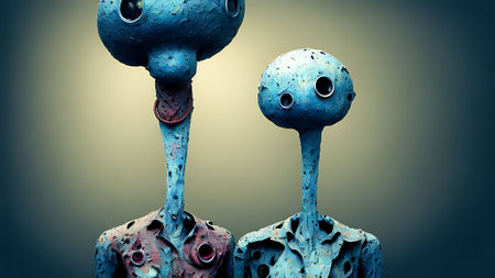 portrait of two robotic women standing back to back. abstraction on the topic of technology and games. 3d illustration