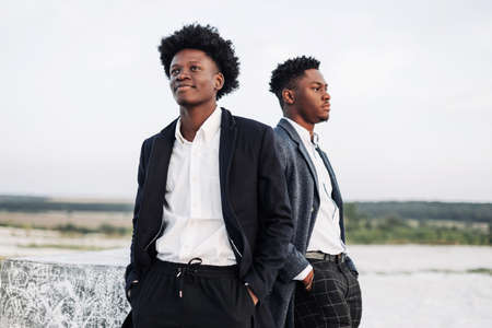 Two stylish handsome black curly haired men posing in elegant suits, two men looking to the side, posing in the street against the backdrop of rocky chalk mountains at sunset