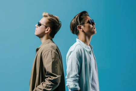 Two stylish men with varying facial features and ethnicities, posing against a dynamic, hand-painted background. A mix of contrast and connection.