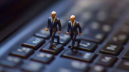 This captivating image features two miniature business figures walking on a laptop keyboard, symbolizing the intersection of technology and professionalism in today's work environment.