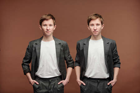 Portrait of serious handsome fashionable twins in smart casual suits and white tshirt holding hands in trousers pockets against brown background